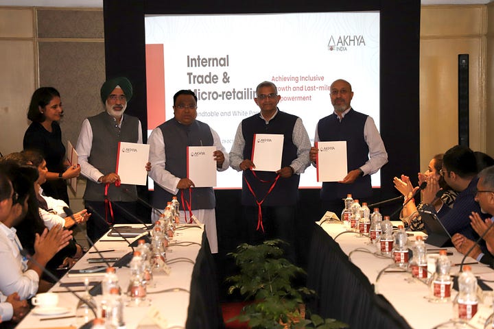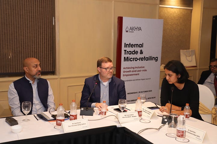 Aakhya India organised a high-level roundtable and whitepaper launch on “Internal Trade & Micro-Retailing: Achieving Inclusive Growth and Last-mile Empowerment” in New Delhi yesterday. We were honoured to have Dr. Sasmit Patra, Member of Parliament (Rajya Sabha), and Mr. Sanjeet Singh, Senior Advisor, NITI Aayog, deliver the keynote addresses. Their presence underscored the growing policy focus on building a facilitative trade environment that empowers micro-entrepreneurs and strengthens domestic commerce.