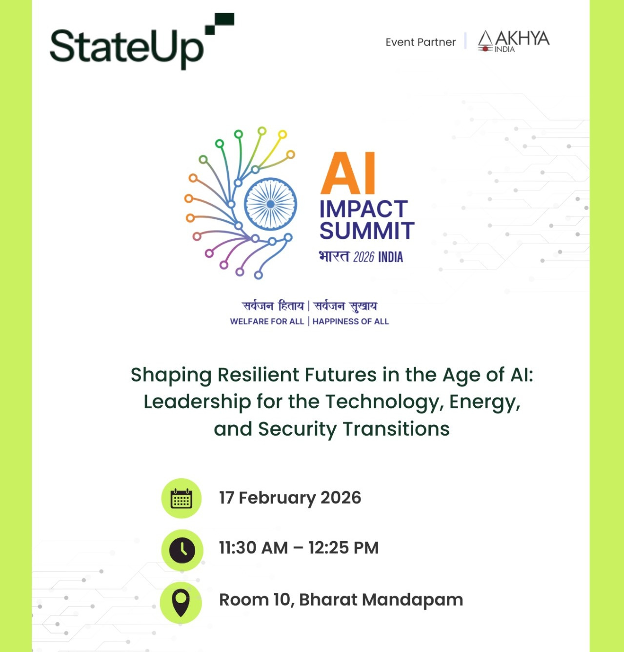 Aakhya India is proud to partner with StateUp for the session “𝐒𝐡𝐚𝐩𝐢𝐧𝐠 𝐑𝐞𝐬𝐢𝐥𝐢𝐞𝐧𝐭 𝐅𝐮𝐭𝐮𝐫𝐞𝐬 𝐢𝐧 𝐭𝐡𝐞 𝐀𝐠𝐞 𝐨𝐟 𝐀𝐈: 𝐋𝐞𝐚𝐝𝐞𝐫𝐬𝐡𝐢𝐩 𝐟𝐨𝐫 𝐭𝐡𝐞 𝐓𝐞𝐜𝐡𝐧𝐨𝐥𝐨𝐠𝐲, 𝐄𝐧𝐞𝐫𝐠𝐲, 𝐚𝐧𝐝 𝐒𝐞𝐜𝐮𝐫𝐢𝐭𝐲 𝐓𝐫𝐚𝐧𝐬𝐢𝐭𝐢𝐨𝐧𝐬” at the upcoming India AI Impact Summit 2026.
